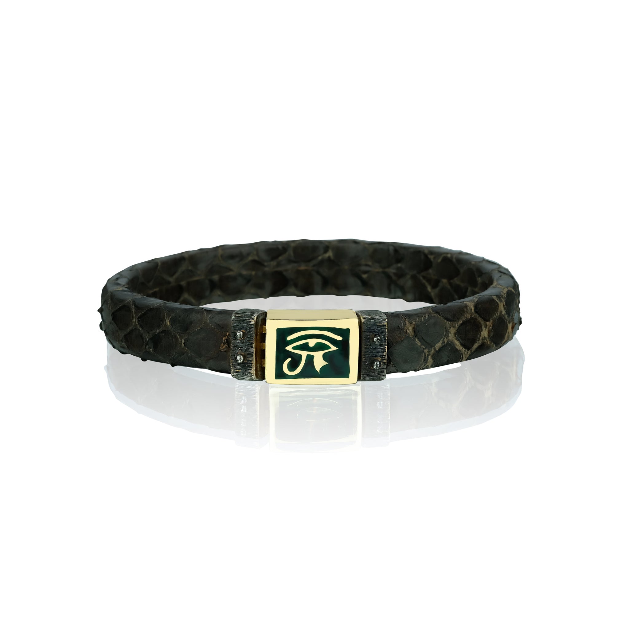 Green leather bracelets, 925 silver 14K gold plated The Eye of Ra symbol adored with enamel Designed by Birce Akalay
